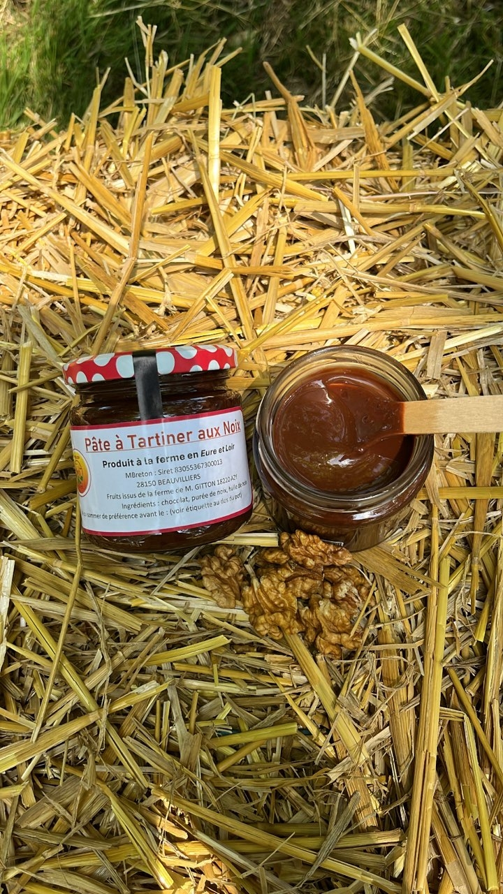 Pâte à tartiner chocolat et noix. Réalisée sur la ferme.